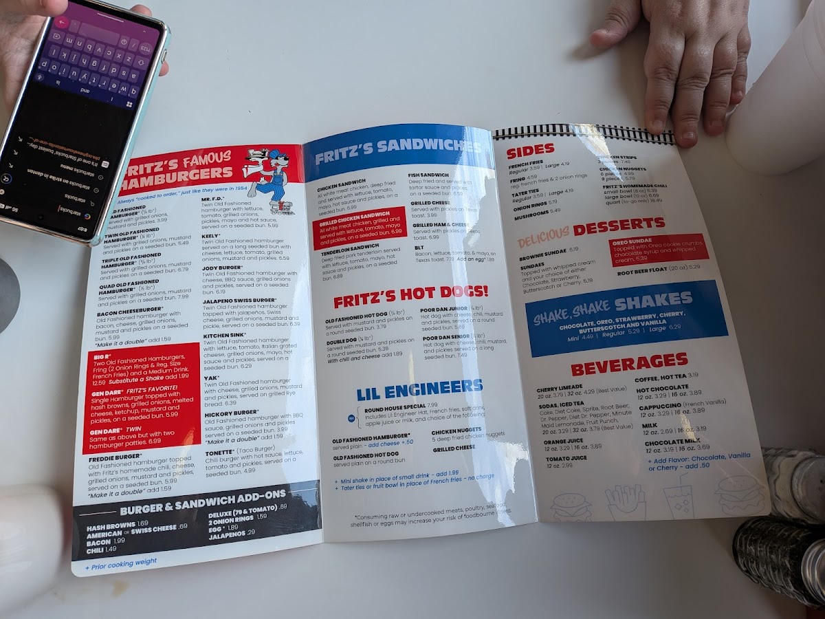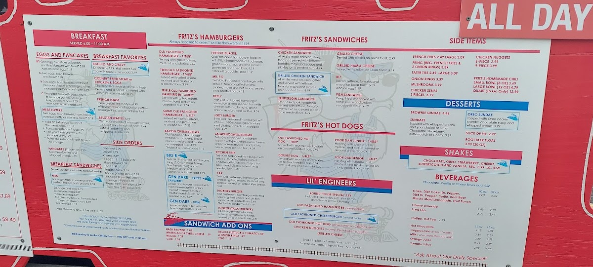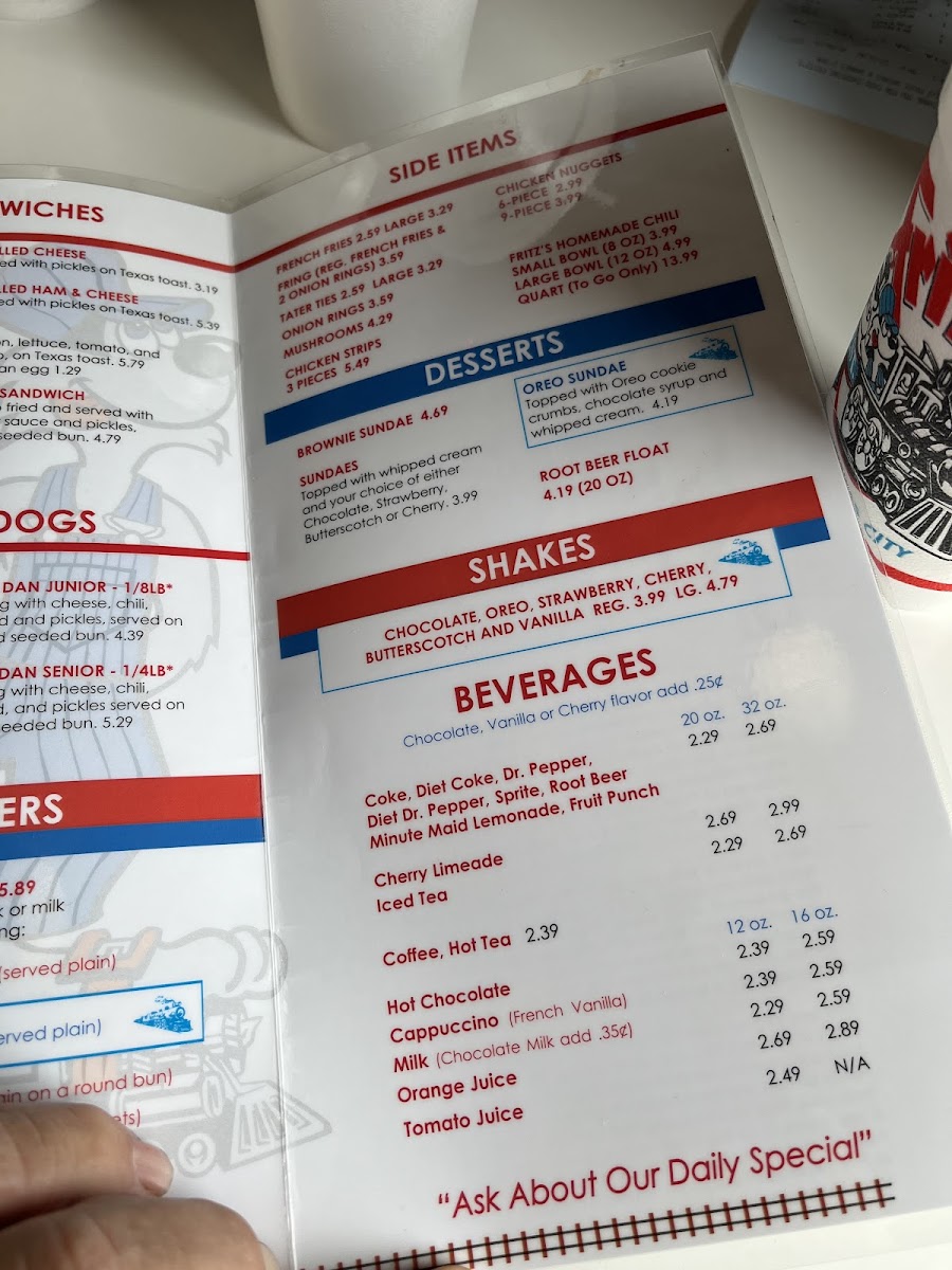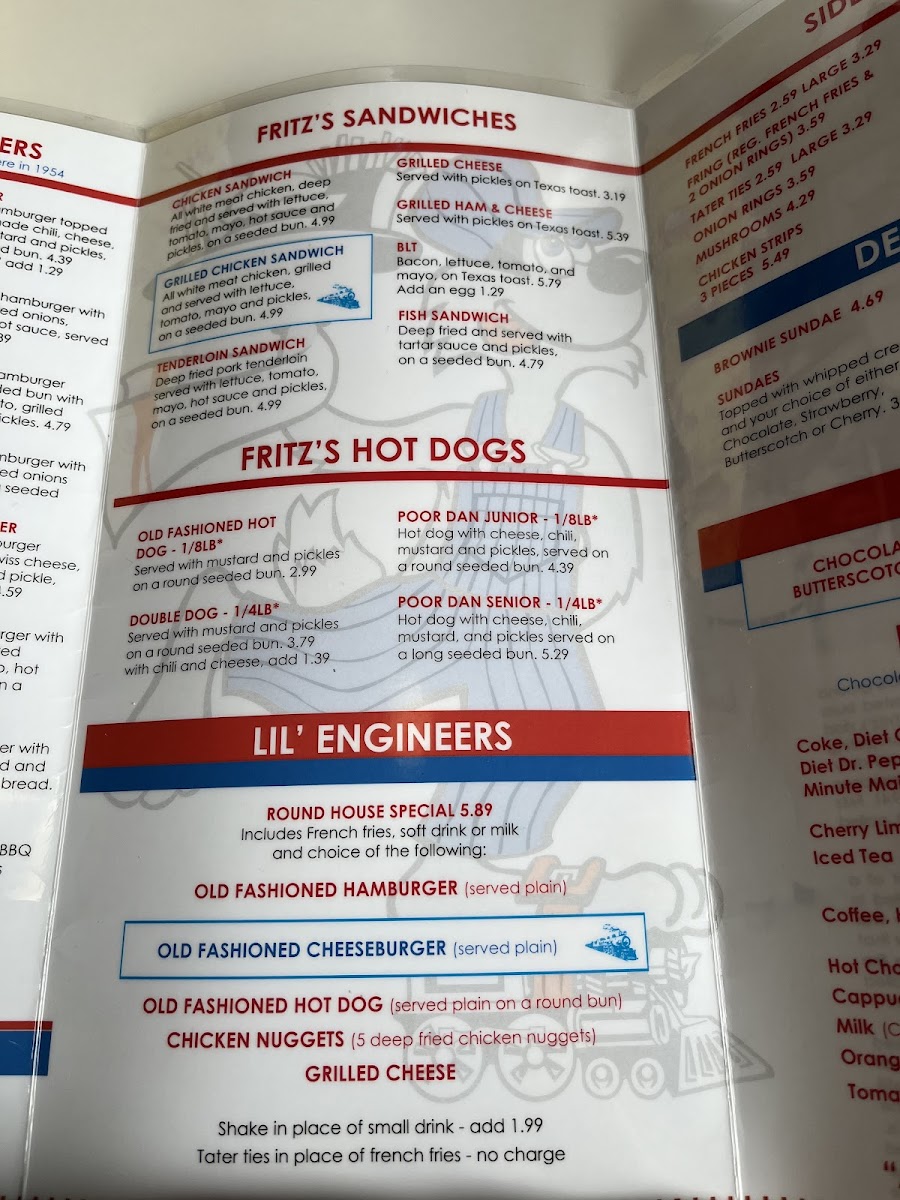 Includes your choice of French fries or Tater ties, soft drink, or milk. Substitute a mini shake add $1.99 Served plain.