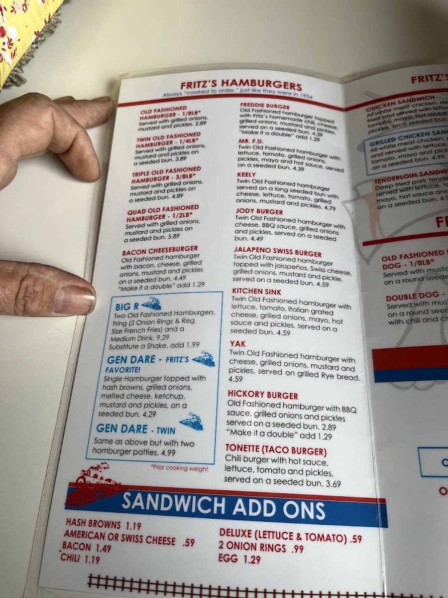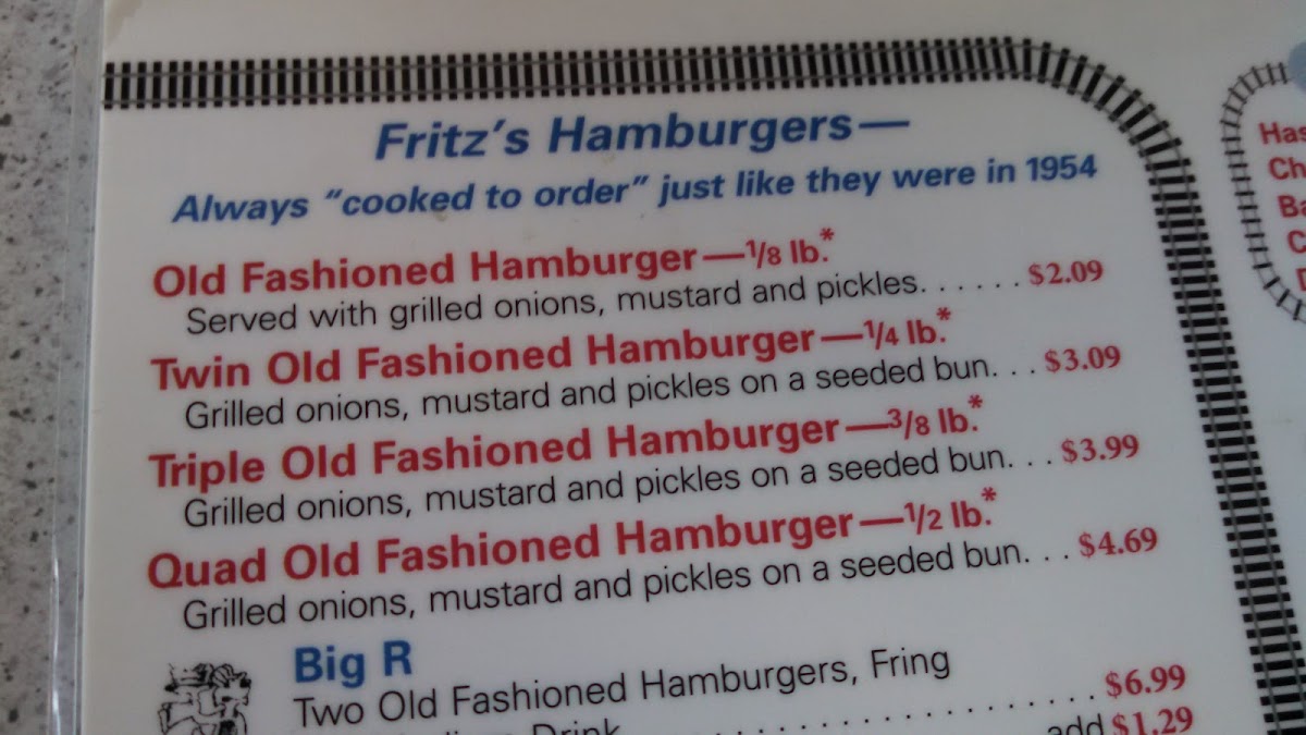 A Fritz's Favorite! Single hamburger topped with hash browns, grilled onions, melted cheese, ketchup, mustard and pickles, on a seeded bun.