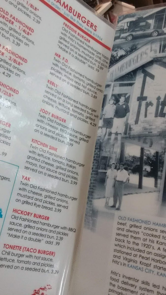 Old fashioned hamburger topped with Fritz's homemade chili, cheese, grilled onions, mustard and pickles, served on a seeded bun.